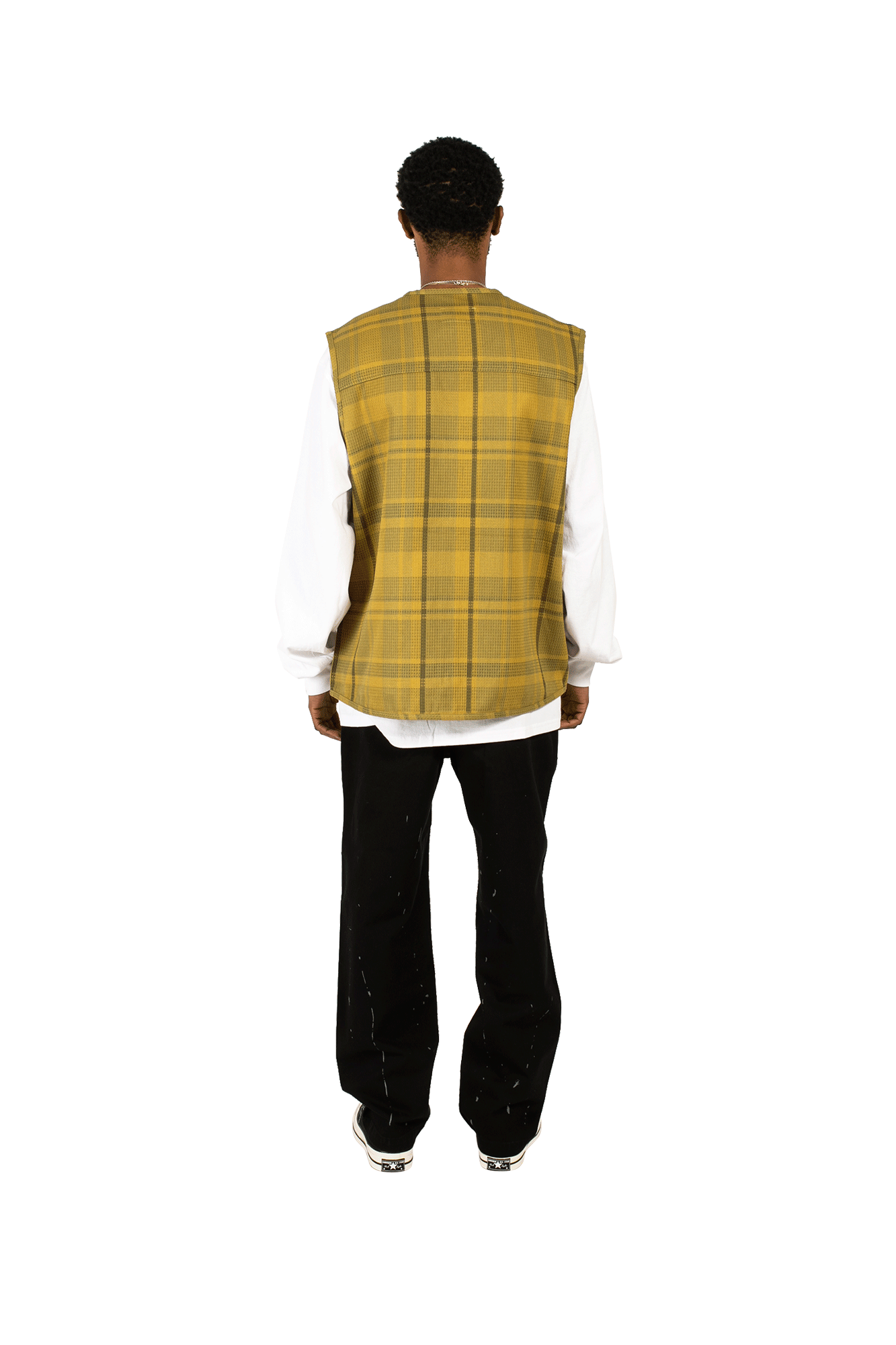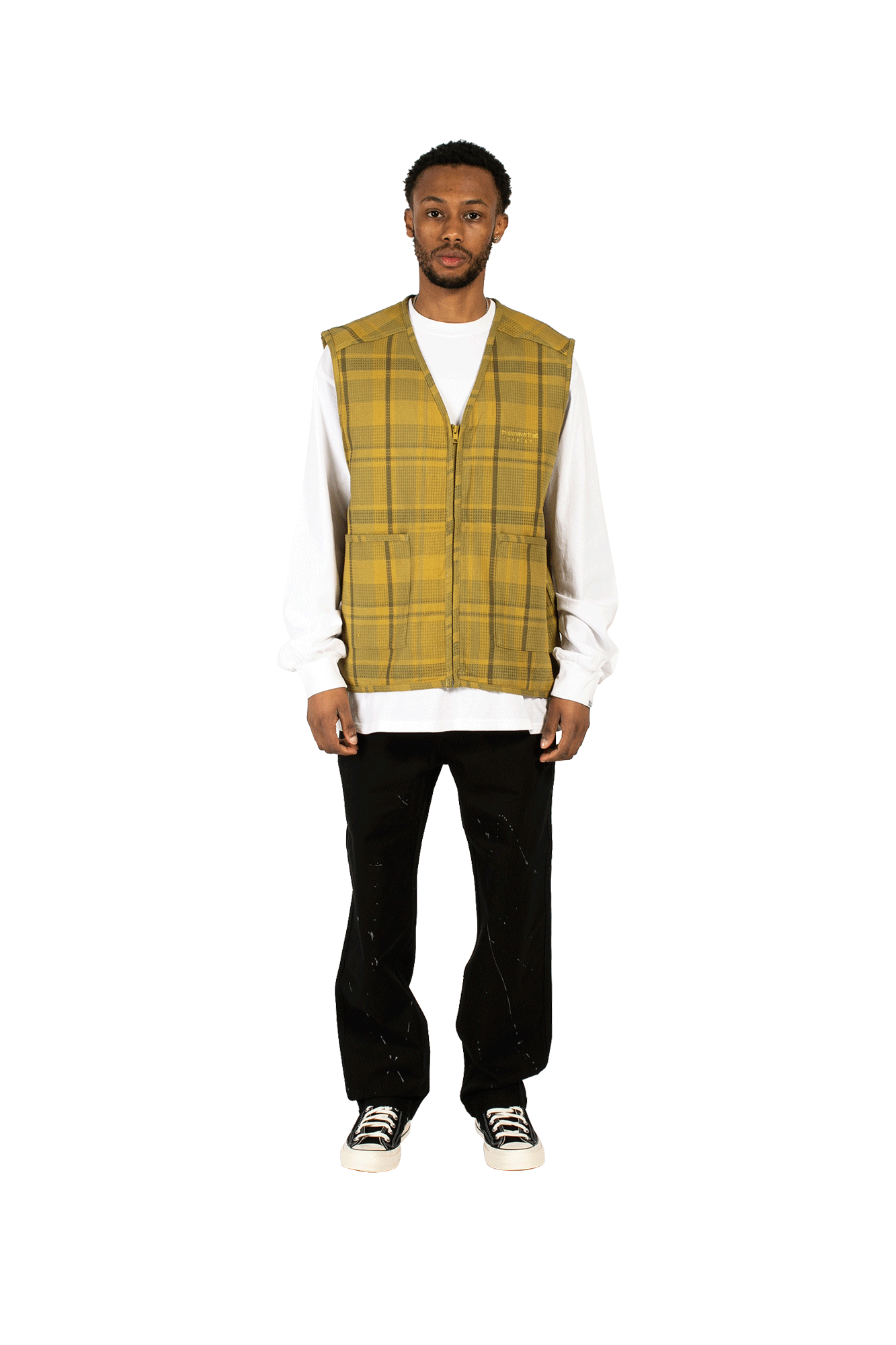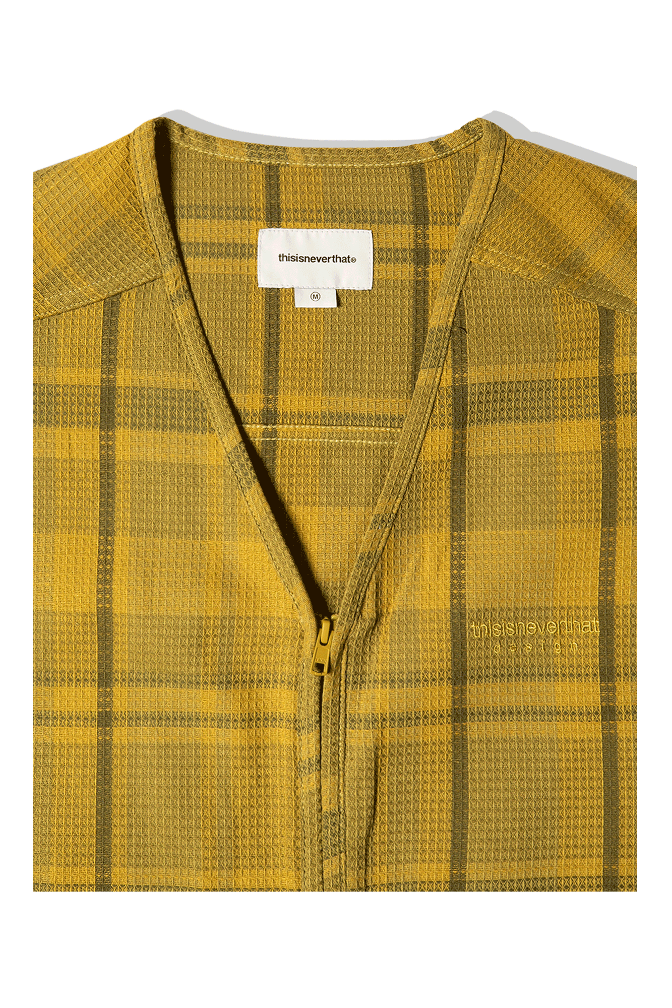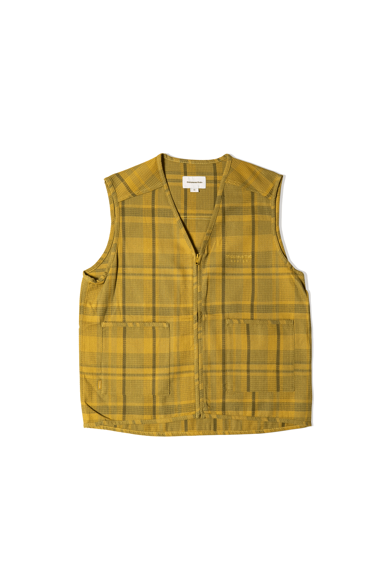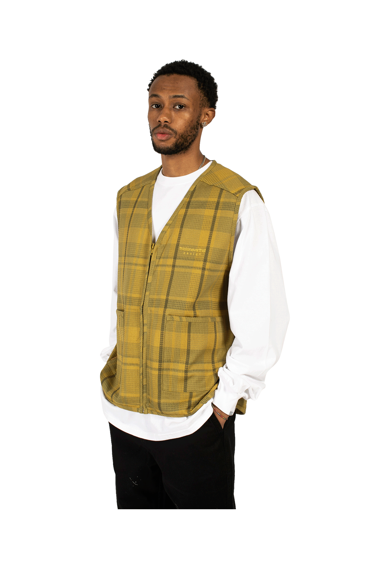 thisisneverthat’s vest is made from cotton and nylon with a textured waffle finish. It features a mustard and tonal brown checked pattern and is discreetly embroidered at the chest with the brand’s name. Entitled ‘NO VISIONS’, the brand’s Spring/Summer 2022 collection is inspired by ‘90s casualwear. Launched in Seoul in 2010, thisisneverthat has grown into one of the most influential brands in the world of streetwear. Known for its graphics-heavy designs, the brand has an extensive following that includes members of both the mainstream and underground music scenes.